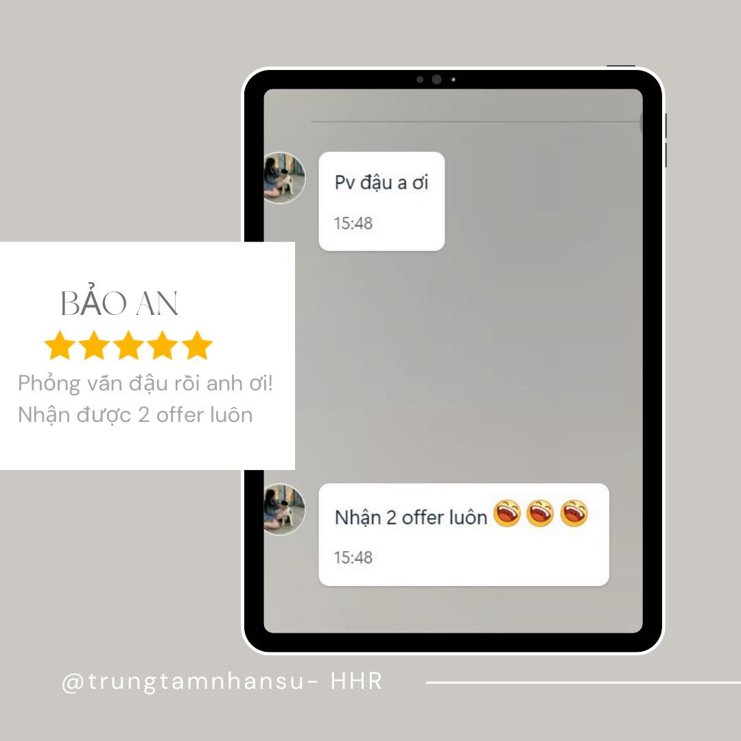 Tại Trung tâm Nhân sự, chúng tôi cam kết dạy bám sát thực tế 100%. Điều này đã được chứng minh qua thành tựu nổi bật của học viên khi họ bước ra ngoài và đón nhận các offer công việc với mức lương ấn tượng. Chúng tôi tự hào về những người học của mình và hy vọng sẽ giúp bạn đạt được những thành công tương tự!”